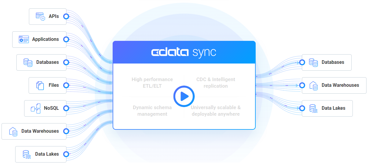 使用 CData Sync 的自动数据集成简化您的数据处理。此高级功能允许您将来自多个来源、各种格式和结构的数据组合并同步到您的集中式数据仓库中。无需人工干预 — CData Sync 可执行近乎实时的更新,确保为您的分析和运营需求提供一致的数据可用性。