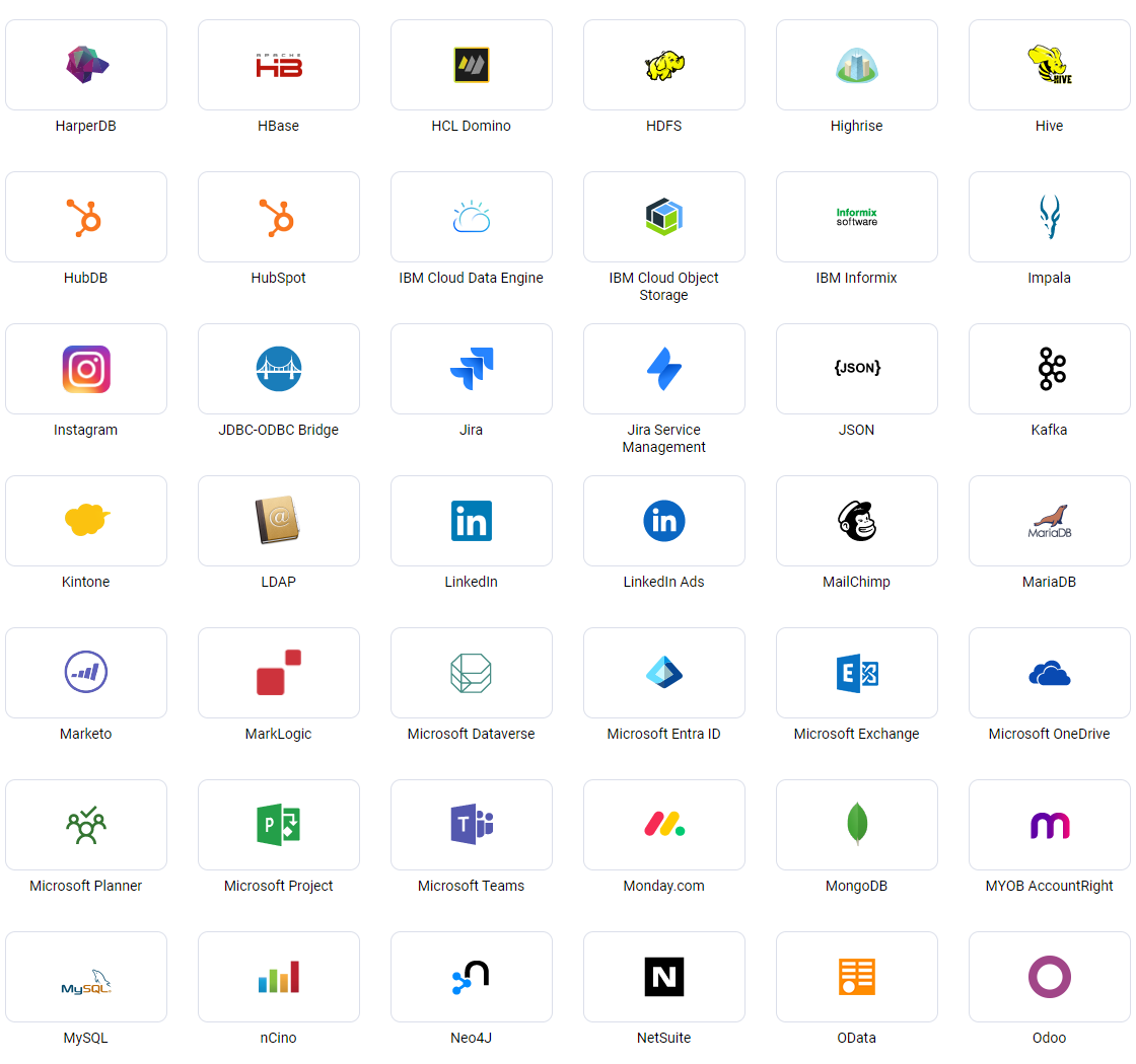 我们世界一流的集体解决方案以简单的集成方法为中心,提供易于使用的数据提供程序、驱动程序和工具,这些工具可从任何能够与主要数据库标准交互的技术中获得。我们的连接器在不同数据源之上创建通用数据库抽象,以标准化应用程序与数据连接的方式。