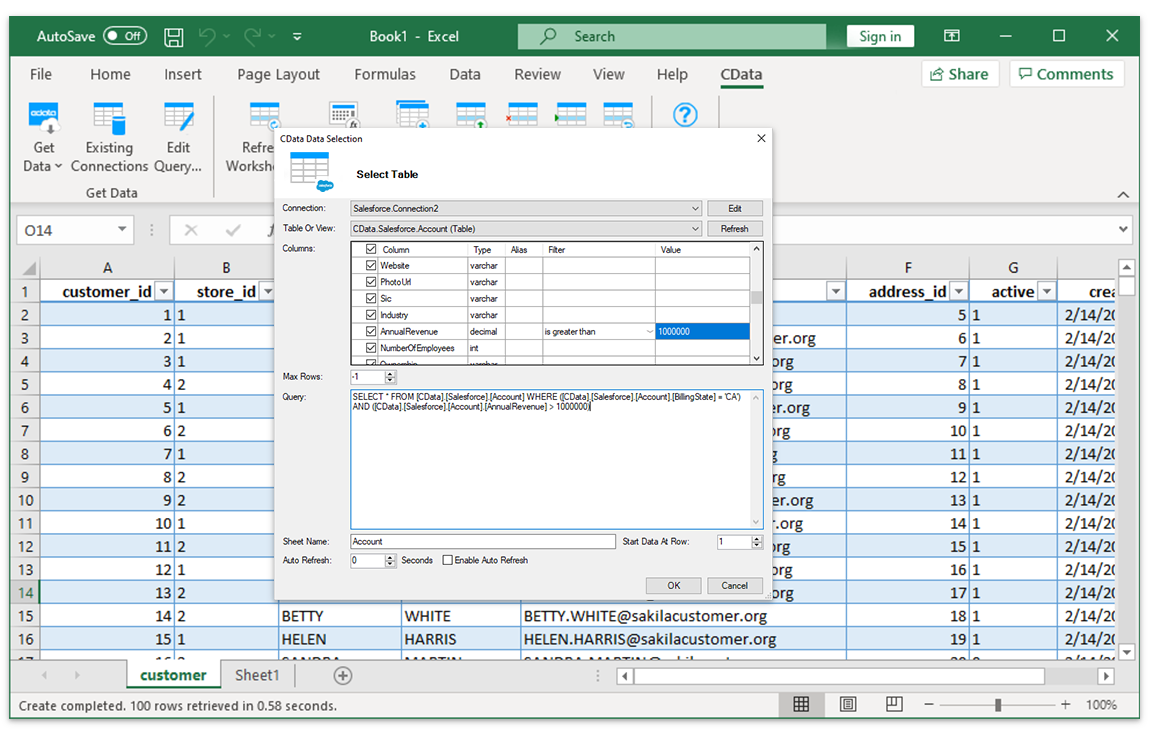 配置数据连接后,只需指定表格,Excel 插件就会用实时数据填充新的 Excel 表。用户可以选择按需或按预定义的间隔刷新数据。